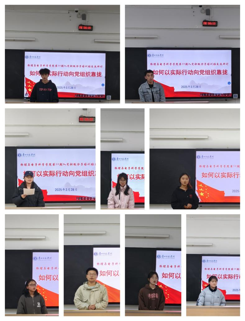 2025年3月28日,动漫之家 第59期入党积极分子培训班在宁静楼427教室开展以“如何以实际行动向党组织靠拢”为主题的交流研讨。本次党课由学院党委组织委员雷仕娜主持,学院全体入党积极分子参加了本次研讨。 入党积极分子们围绕“如何以实际行动向党组织靠拢”交流发言。交流中,大家结合自身实际,分别从思想上、学习上、生活中以及行动上如何增强理论学习,践行党的宗旨,端正入党动机,积极参加党组织的各项活动不断增强政治素养和提升自身综合素质进行交流,切实做到从思想到行动都与党保持高度一致。 交流结束,雷仕娜对本次交流发言进行总结,希望每一位入党积极分子都心怀崇敬,在学习、生活中时刻以党员标准严格要求自己,筑牢理想信念之基,争取早日加入中国共产党,为党和人民的事业建设添砖加瓦。 文/图:朱启月 陆宇航 初审:雷仕娜 复审:吴丽 终审:熊德永