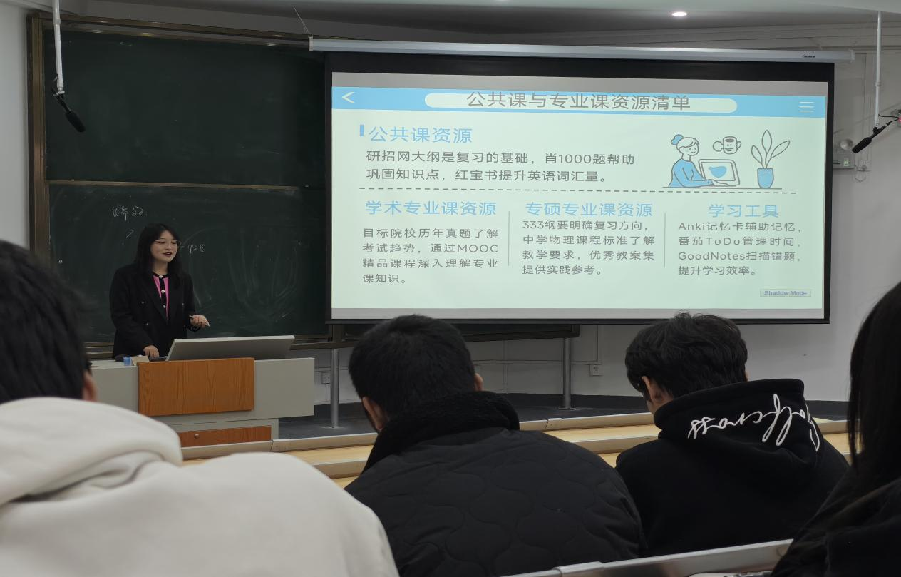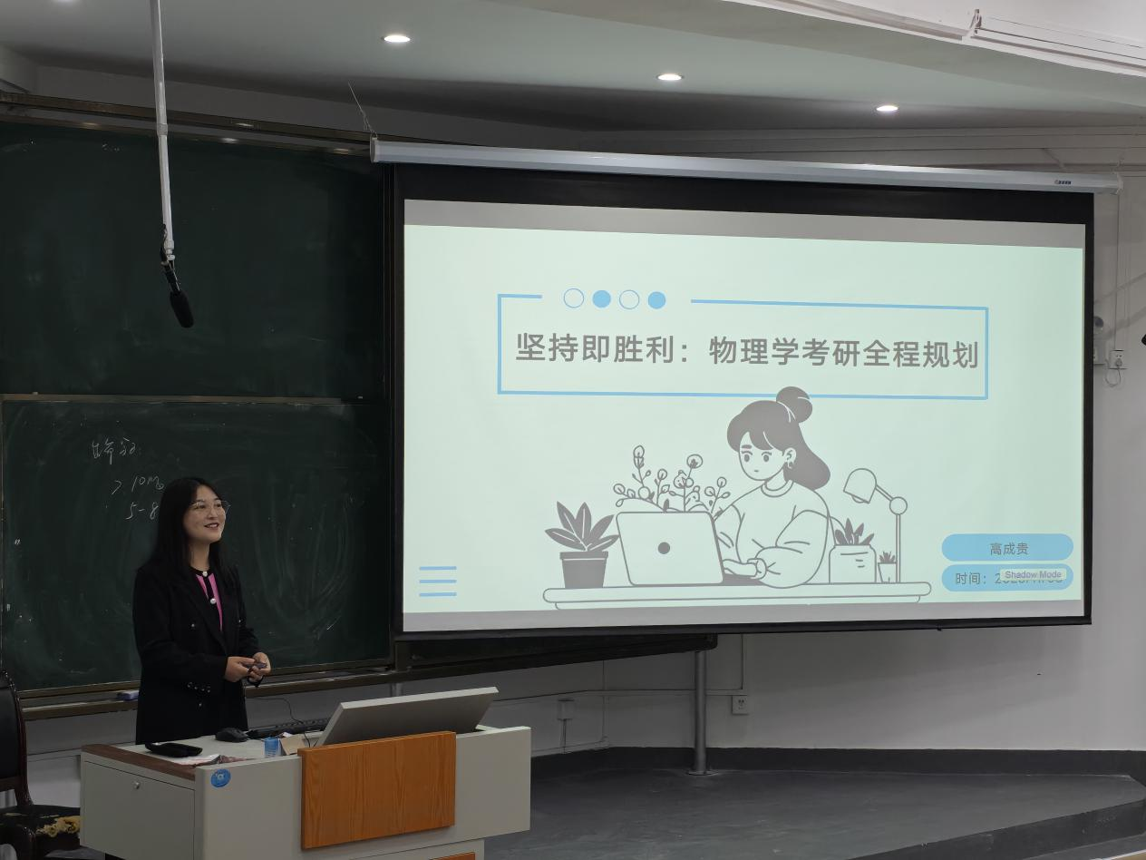 2025年11月5日上午,物电学院在宁静楼435教室成功举办“坚持即胜利:物理学考研规划”专题讲座。本次讲座由高成贵老师主讲,2023级物理学专业全体学生参加,动漫之家 岳天天老师主持。 高成贵围绕考研初心、成功要素、学硕与专硕区别、复习规划及心态调整等核心内容展开,为有志于考研深造的学子提供了系统性指导,现场互动热烈,学生收获颇丰。 高成贵指出持续学习超过10个月、日均有效学习6小时以上,上岸率可超过80%,并进一步强调了坚持与方法的重要性。针对物理学考研的两大方向——学术型硕士(学硕)与专业型硕士(专硕),详细对比了两者的区别、分析了两种选择的适合对象、考试科目及各自的优势与挑战,帮助同学们根据自身目标做出合理选择。最后,高成贵老师详细讲解了考研复习的三个关键阶段:基础阶段、强化阶段、冲刺阶段,针对英语、高数(一)、专业课等核心科目,提供了具体的复习方法以及公共课与专业课的优质资源清单,帮助同学们高效利用时间,精准复习。针对备考过程中常见的心态波动,高成贵老师给出了实用建议:制定小目标并打卡,每完成一项打勾,逐步建立信心;适度运动,缓解压力,保持身心健康;避免盲目比较,专注自身节奏,减少焦虑。她以温暖的话语鼓励同学们:“坚持终将遇见理想的自己!” 通过本次讲座,进一步帮助备战考研的同学明确了考研目标,理清了复习思路,不再迷茫,助力学子在科研与职业道路上走得更远、更稳。 图文/刘家兴 何莉娜拉 一审/岳天天 二审/蔡晶 三审/刘高福