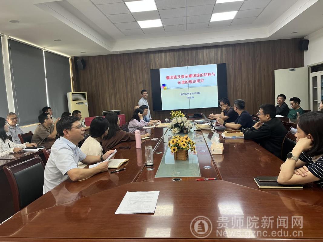 教授李世雄、副教授冀慎统、陈雨以及高级实验师高成贵主讲。 首先,冀慎统以“数值模拟 BEC 中孤子和干涉现象”为题展开报告。详细讲解了玻色-爱因斯坦凝聚体中的干涉、双组分玻色-爱因斯坦凝聚体中的环状暗孤子等内容,为量子信息处理提供新路径。 随后,李世雄分享了“硼团簇及掺杂硼团簇的结构与光谱的理论研究”。他系统阐述了基于密度泛函理论,对Bn0/−(n=38-40)的电子结构与光谱性质进行深入的比较分析,并基于密度泛函理论研究了硼富勒烯B40的外电场效应,分析外电场下硼富勒烯B40的电子结构与光谱性质的变化,通过理论建模揭示掺杂元素对团簇光谱特性的调控机制,为新型功能材料设计提供理论支撑。 陈雨以“量子 Fisher 信息与精密测量”为题,阐释相位噪声激光下量子Fisher信息的动力学特性研究,开放量子系统下基于量子弱测量和前后翻转的量子Fisher信息保护。 最后,高成贵聚焦“介电超构表面谐振腔共振模式与激子的强耦合研究”。主要阐述了ETD/MTD共振模式与激子的强耦合特性研究,共振波长稳定的ETD-QBIC共振模式与激子的强耦合特性研究,并展示了最新的研究成果。 讲座结束后,参会师生针对讲座内容进行提问和讨论,现场学术研讨氛围热烈。会议最后,刘高福强调本次系列讲座涵盖理论模拟与实验研究,为师生搭建了跨方向学术交流平台。参会师生纷纷表示,讲座内容兼具深度与广度,不仅增进了对前沿领域的理解,更激发了交叉研究的创新灵感,将推动学院科研工作进一步发展。 文/图:岳天天 一审:岳天天 二审:蔡晶 终审:刘高福