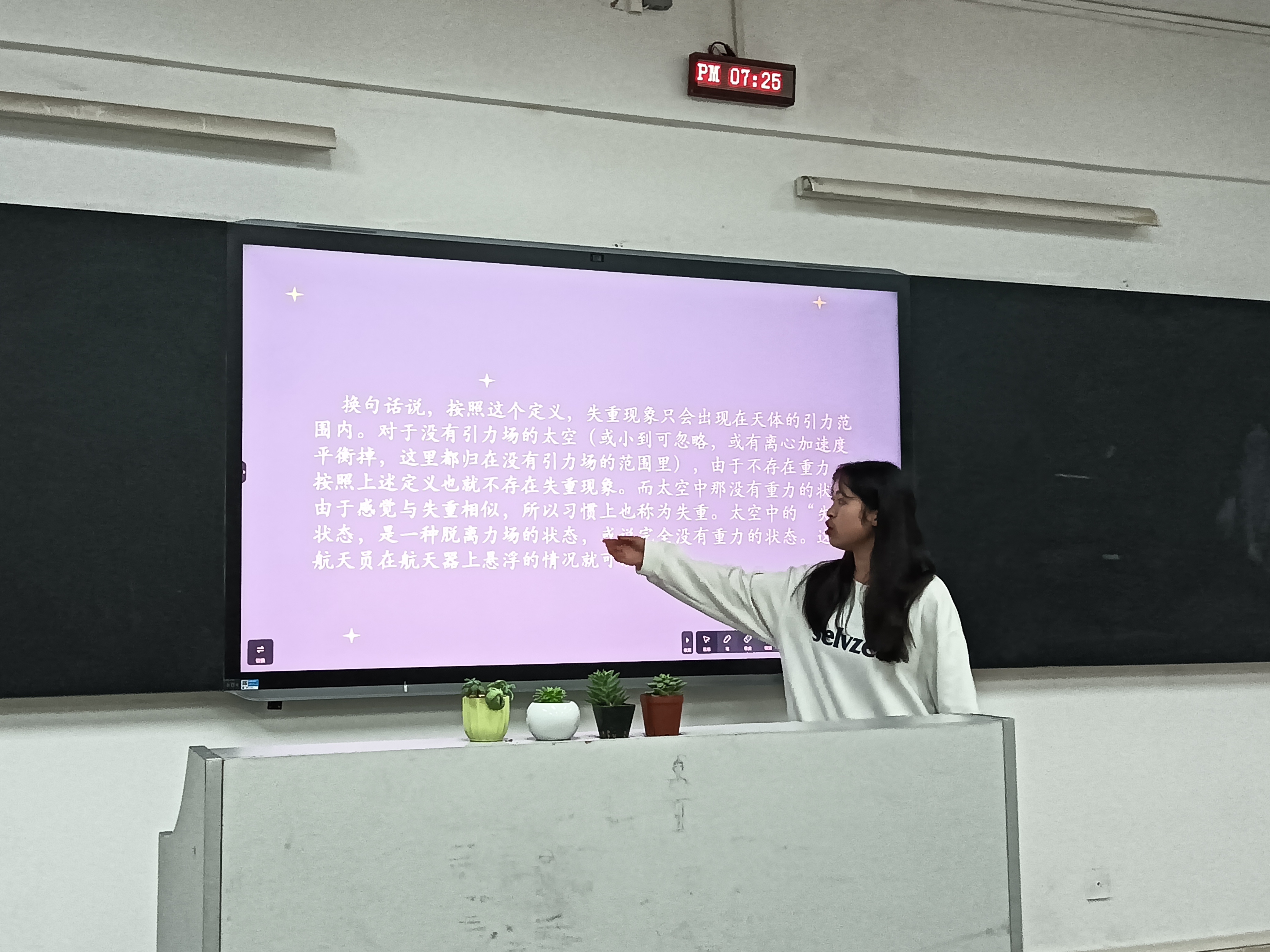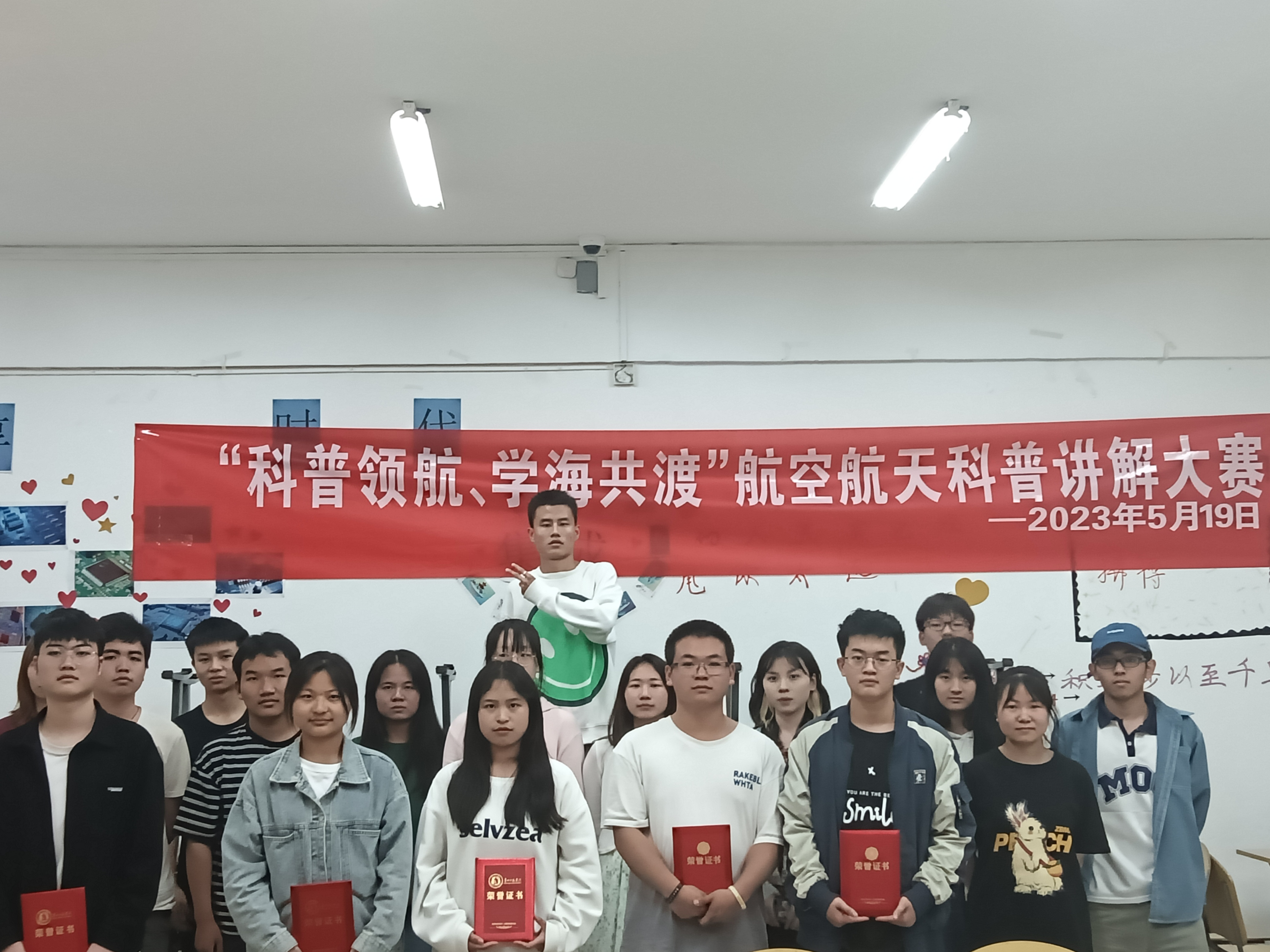 进一步宣扬崇尚科学、探索未知、勇于创新的新时代航天精神.5月19日,动漫之家 在宁静楼429举办第二届“星光杯”科普讲解大赛预赛。本次比赛由22级旅游与文化学院的蔡洋主持。 首先,赛前每位选手都需要抽签决定出场顺序;接着,选手们分享自己对航空航天知识的了解;然后,随机抽取关于航天航空的知识命题进行回答;最后,由评委对选手进行提问。本次比赛选出两名优秀选手参加决赛,分别是22级集成电路与集成系统班苟源泉、物理一班何家杰。 本次比赛的进行,让同学们能了解到更多关于航天航空的知识,激发师院学子对航天航空知识领域的探索,让同学们知道并学习到新时代航天精神。