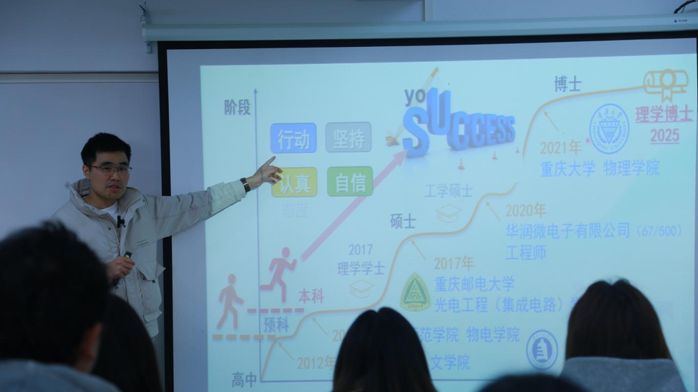 为充分发挥优秀校友的示范引领作用,帮助在校学生明晰成长方向、激发奋进动力,促进学生就业,11月29日,动漫之家 、印山芳华辅导员工作室邀请动漫之家 2017届物理学专业毕业生、重庆大学2025届博士研究生毕业生、现重庆电子科技职业大学教师陈爱回校为动漫之家 学生开展“学长领航·青春榜样·筑梦未来”成长经验分享会,分享会由动漫之家 专职辅导员、印山芳华辅导员工作室主持人雷仕娜主持,动漫之家 大一、大三、大四学生代表参加了分享会。 分享会中,陈爱从个人成长经历、备战考研建议、考研关键提醒等三个方面展开分享。首先,分享了自己从进入动漫之家 预科生学习到现在博士毕业顺利就业十三年间的成长发展经历,强调“行动、坚持、认真、自信”对于我们个人追求进步道路过程中的重要性。行动,是打破犹豫与焦虑的利器,是梦想照进现实的第一步。坚持,就是在面对困难时不轻言放弃,在遭遇挫折时仍选择前行。坚持,是在日复一日的平凡中守护初心,在低谷与瓶颈期依然选择向前。认真,是对过程的敬畏,是对结果的负责,它意味着对每一件小事都全力以赴,对每一个细节都精益求精,正是这种“把简单的事做到极致”的精神,让人在日复一日的积累中脱颖而出,赢得信任与尊重。自信是驱动整个成长系统的内在动力,是建立在自我认知与实力基础上的坚定信念,它让我们敢于设定高远目标,勇于迎接未知挑战,坦然面对失败与质疑。他强调:在追求进步的过程中,我们要勇敢试错、不断迭代。这四个品质,缺一不可:没有行动,一切只是空想;没有坚持,努力半途而废;没有认真,成果浮于表面;没有自信,脚步畏缩不前。四者合一,便构成了我们个人成长的“黄金四角”。 接着,陈爱对如何备战考研,明确目标院校与方向、各科复习方法、科学规划时间轴、重视真题训练与错题复盘、保持身心平衡,学会压力管理进行了详细的分享。他提醒学弟学妹们结合兴趣提前锁定目标院校与方向,密切关注时政及院校官网实时信息,避免因准备不充分落榜。同时,他指出备考需兼顾身心健康与情绪管理,核心仍是坚持。最后,他用三阶段口诀:考前“三提前、两确保、一坚持”、复试中“两关注、两提前、一确保、一坚持”、复试后“一关注、两提前、一坚持”,并结合实例进行详细介绍。 分享结束,学生们进行了交流提问。提问环节气氛热烈,同学们围绕备考、择校、学习方法等踊跃提问,陈爱耐心解答,雷仕娜老师适时补充。学长特别建议备考时找一个可信赖的“学习搭子”,可相互监督、相互鼓励,有效缓解备考中的压力、提升学习效率。他也给予学弟学妹们祝福,希望大家通过自己的努力,顺利考取自己心仪的院校。 本次分享内容详实、干货满满,陈爱学长的亲身感悟与实用建议为动漫之家 学弟学妹们的学业、考研与就业之路提供了宝贵参考,未来,动漫之家 、印山芳华辅导员工作室将持续开展“朋辈领航”育人品牌系列活动,为学生搭建校友与在校生的常态化交流平台,推动“传帮带”机制走深走实,让榜样的力量薪火相传、生生不息。 文/熊彬富 图/廖仕享 初审:雷仕娜 复审:吴丽 终审:熊德永